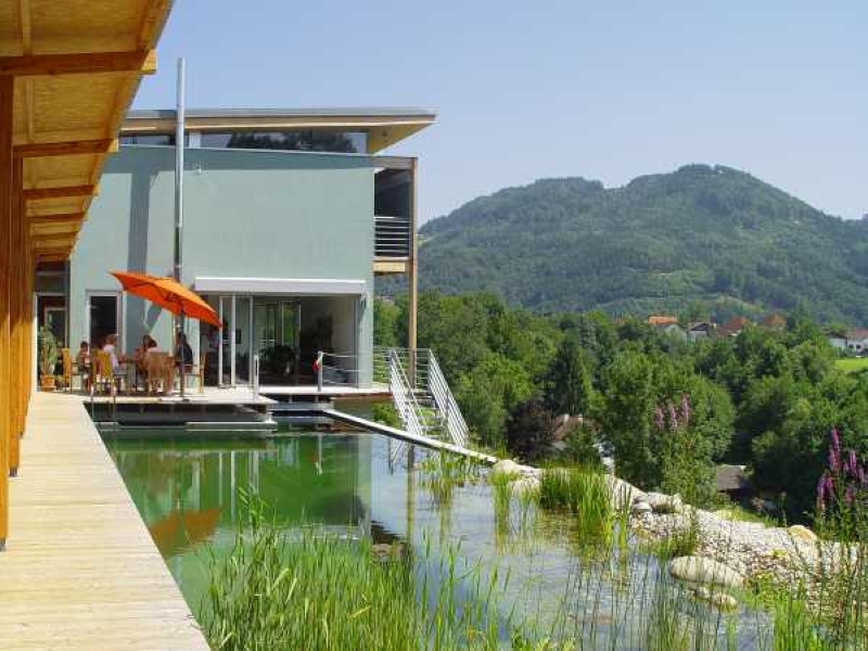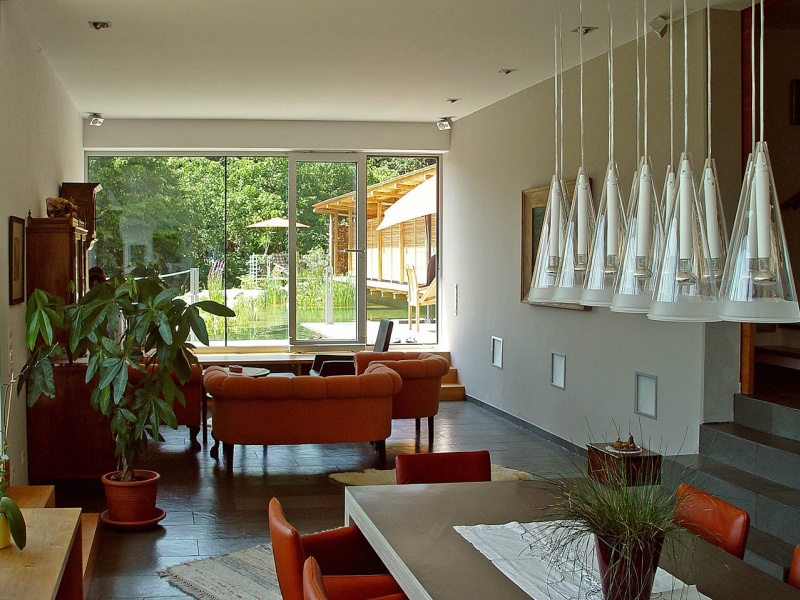 Die Fensterflächen im Wohnzimmer bieten einen einladenden Ausblick auf den großen Schwimmteich der Familie.