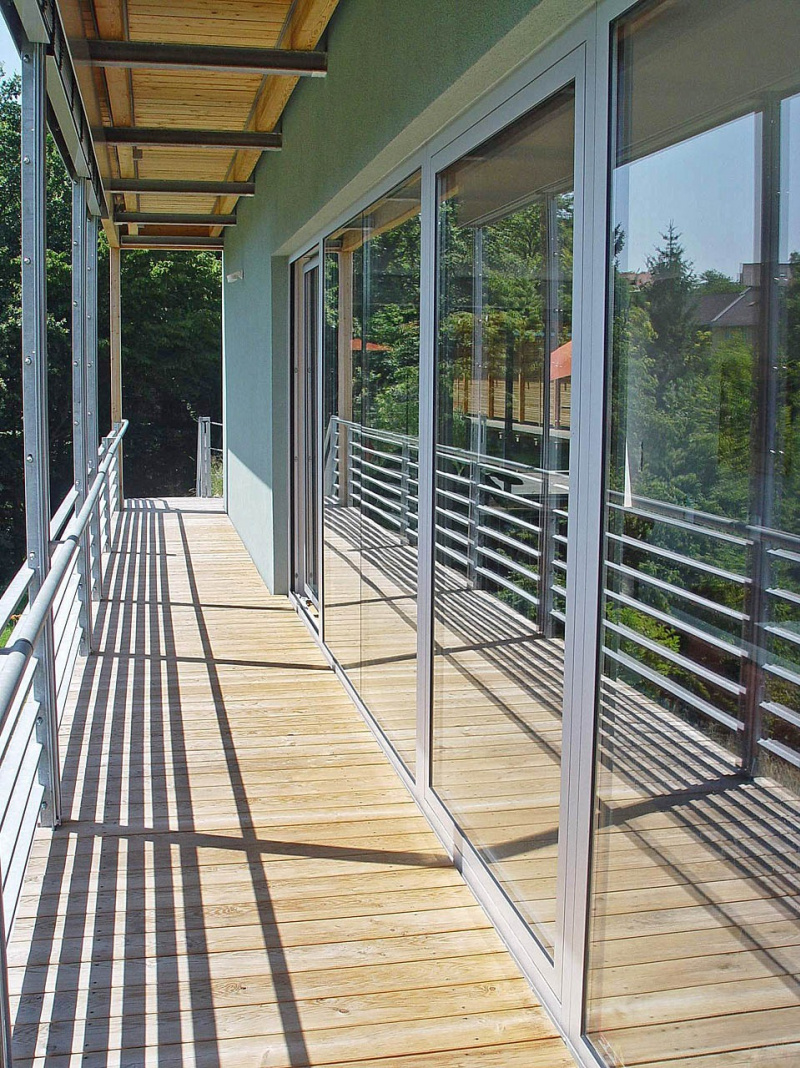 Der vorgelagerte Balkon aus Lärchen-Holz dient nicht nur als Sonnenschutz für die darunter liegende Terrasse, er bietet den Bewohnern eine Sitzgelegenheit mit Blick in die Ferne. Der Balkon kann jeweils von den Schlafzimmern aus erreicht werden.